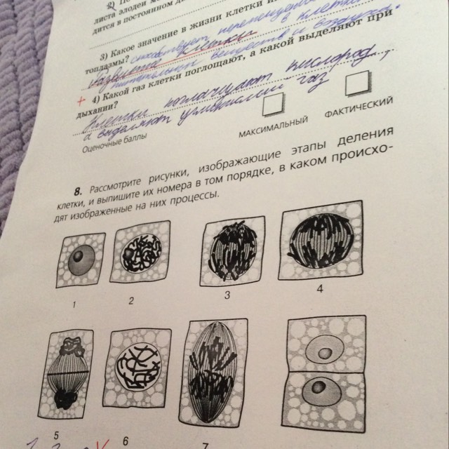Рассмотрите рисунки, изображающие этапы деления клетки, и выпишите их номера в том порядке, в каком происходят изображенные на них процессы.