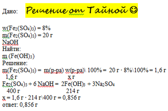 Яка маса утвориться в результаті зливання 20г розчину сульфату ферумуFe2(SO4)3 з масовою часткою певної речовини 8% з розчином NaOH взятому в достатній кількості.