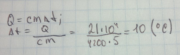 На сколько градусов изменилась температура воды объёмом 5 литров если при этом выделилось 0.21 МДж теплоты?