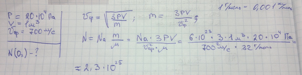 Определите число молекул кислорода в 1 м3, если давление равно 0,20 МПа, а средняя скорость его молекул 700 м/с.