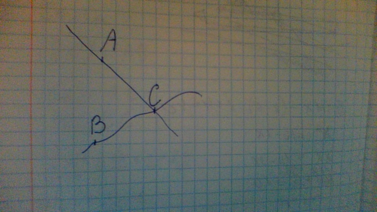 Проведи через точку А прямую линию а через точку В кривую линию так, чтобы они пеесекались в точке С.
