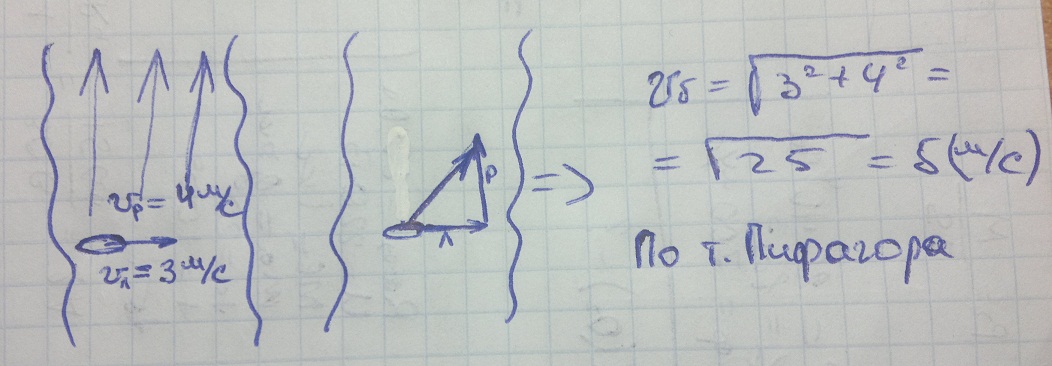 скорость лодки равна 3 метра в секунду,а скорость реки 4 метра в секунду,суорость лодки и скорость реки перпендикулярны между собой ,найти скорость движение относительно берега ?