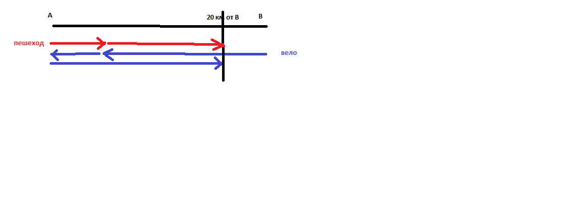 Турист, со скоростью 5 км/ч, вышел из А в В, одновременно из В в А вышел велосипедист и встретился с туристом через 1 ч 12 минут. Прибыв в А, велосипедист ,не останавливаясь, повернул обратно и догнал туриста в 20 км от В. Найти расстояние и скорость велосипедиста
