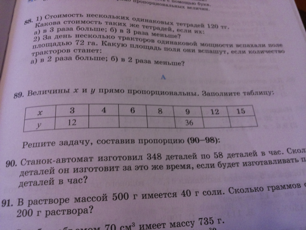y больше x в 4 раза (так как 12 / 3 = 36 / 9 = 4)