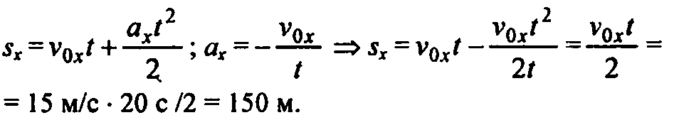 Поезд, идущий со скоростью 15 м/с, остановился через 20 с после начала торможения. Считая, что торможение происходило с постоянным ускорением, определите перемещение поезда за 20 с.