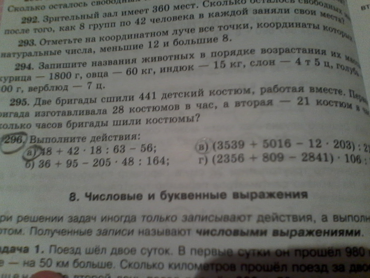 Решите два примера под буквой а и б номер 296 спасибо заранее пример 48 плюс42 умножить на 18 разделить на 63 минус 56 второй пример кавычка открывается 3539 плюс 5016 минус 12 умножить на двести три. Закрывается разделить на 211 равно