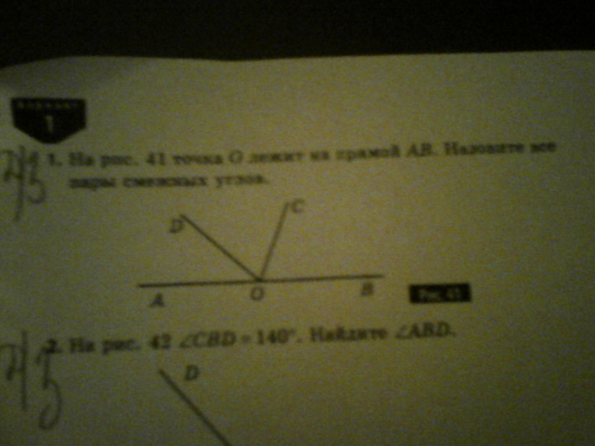 на рис.41 точка 0 лежит на прямой АВ.назовите все пары смежаных углов