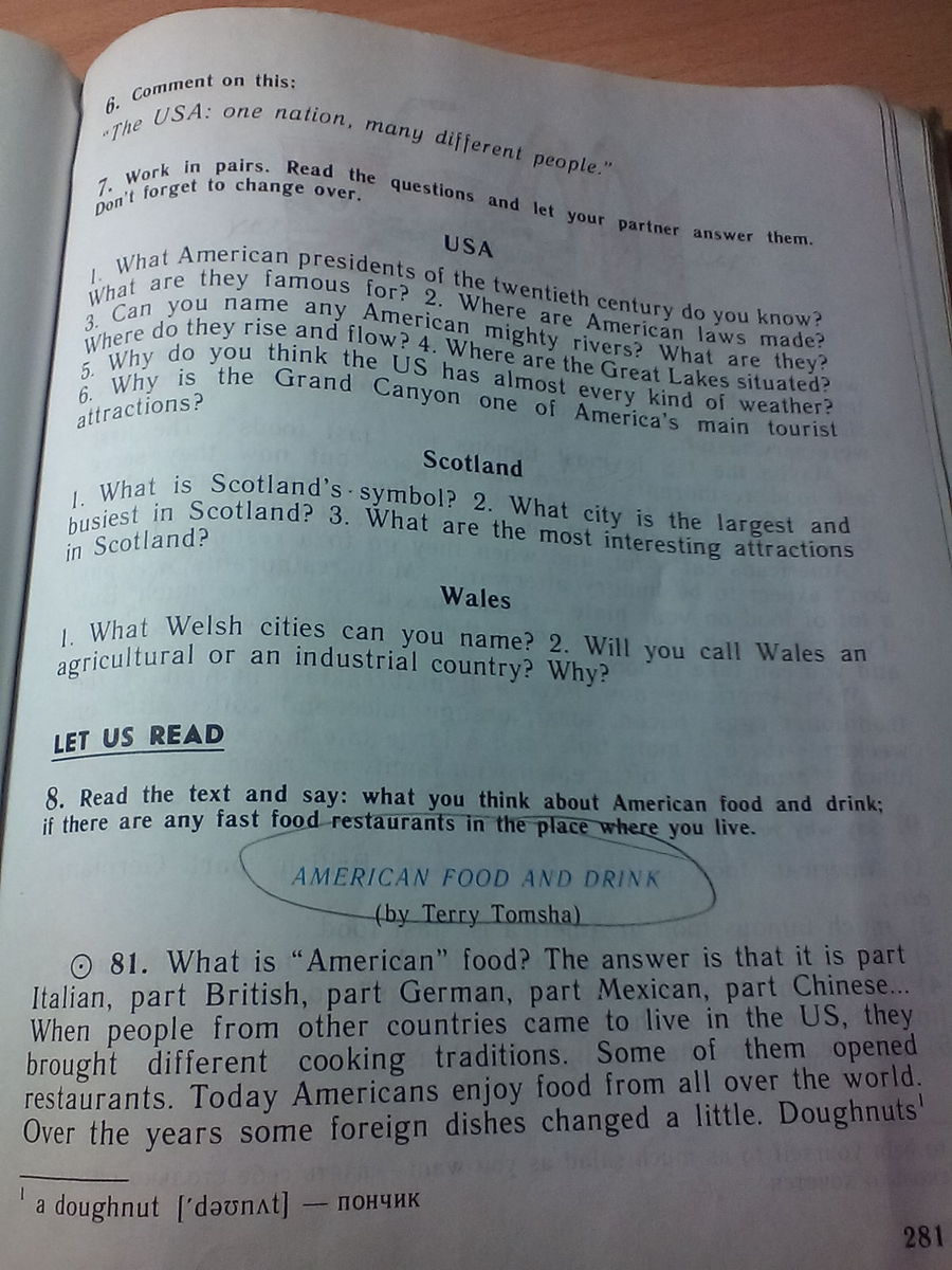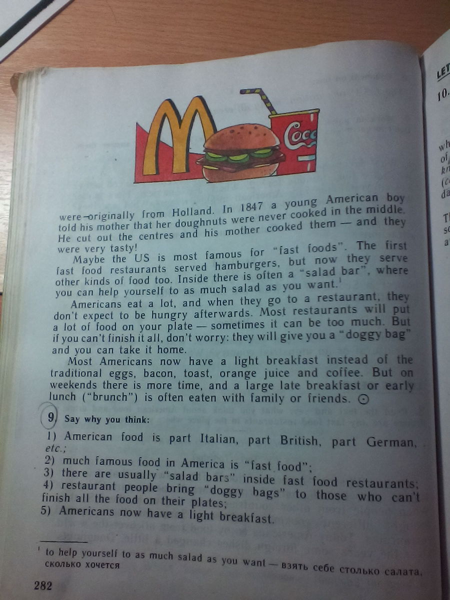Что такое "американская" еда? Ответ таков, что это частично итальянская, частично бринтанская, частично немецкая, частично мексиканская, частично китайская... Когда люди приезжали жить из других стран в Соединенные Штаты, они приносили различные кулинарные традиции. Некоторые из них открывали рестораны. Сегодня американцы наслаждаются едой со всего мира. С годами некоторые блюда немного изменились. Изначально пончики были родом из Голландии. В 1847 году маленький американский мальчик сказал своей матери, что ее пончики всегда не приготовлены в середине. Он вырезал середины и его мама готовила их - они были очень вкусные!