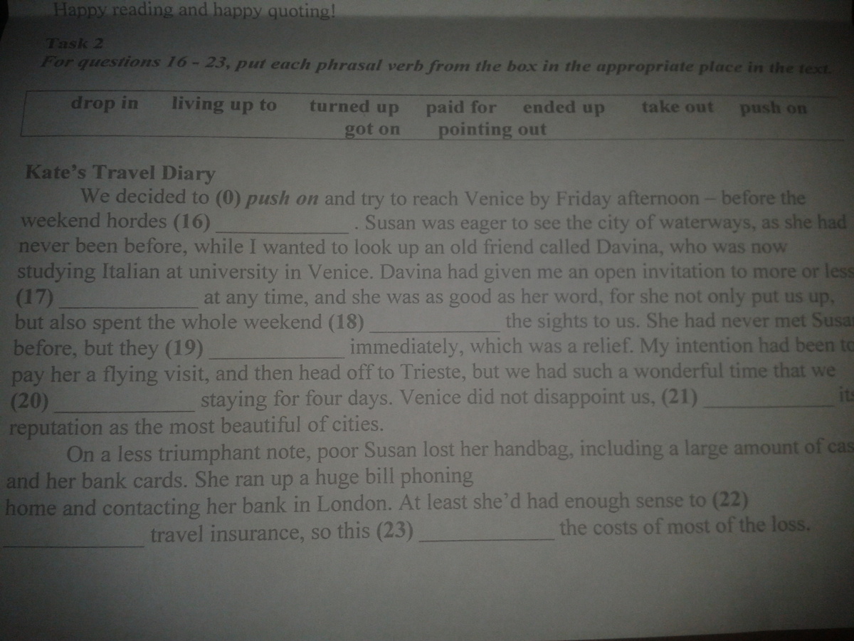 Task 2 . For questions 16-23 put each phrasal verb the box in the appropriate place in the text.