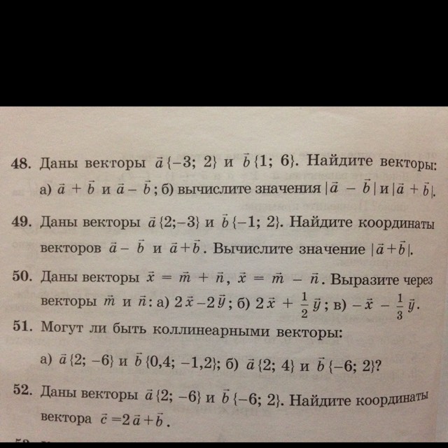 Номер 48: даны векторы а(-3;2) и в (1;6), найдите векторы: а) а+в и а-в; б) |а-в| и |а+в|