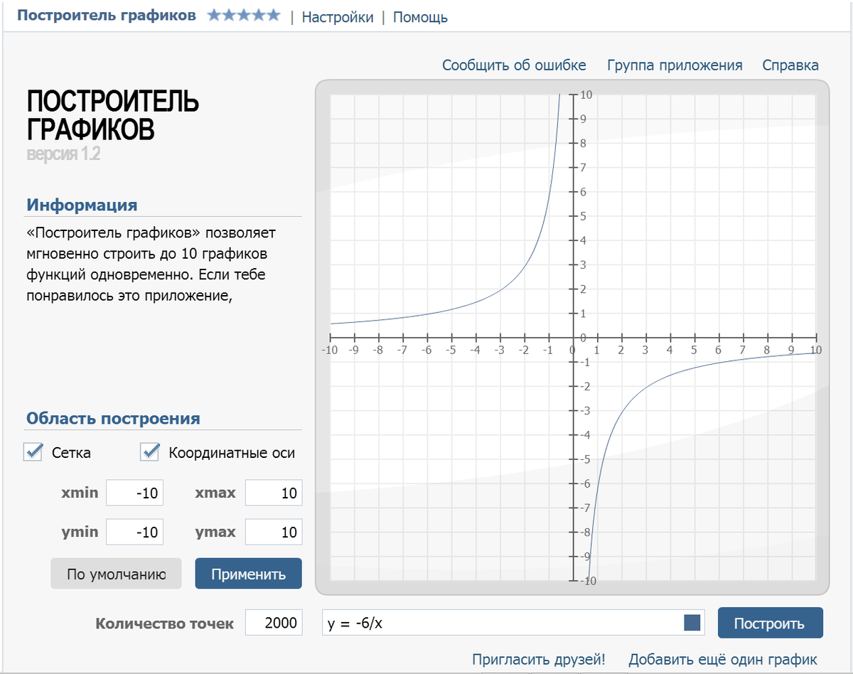 постройте график функции у=-6/x ,какова область определения функции?При каких значениях х функция принимает положительные значениях