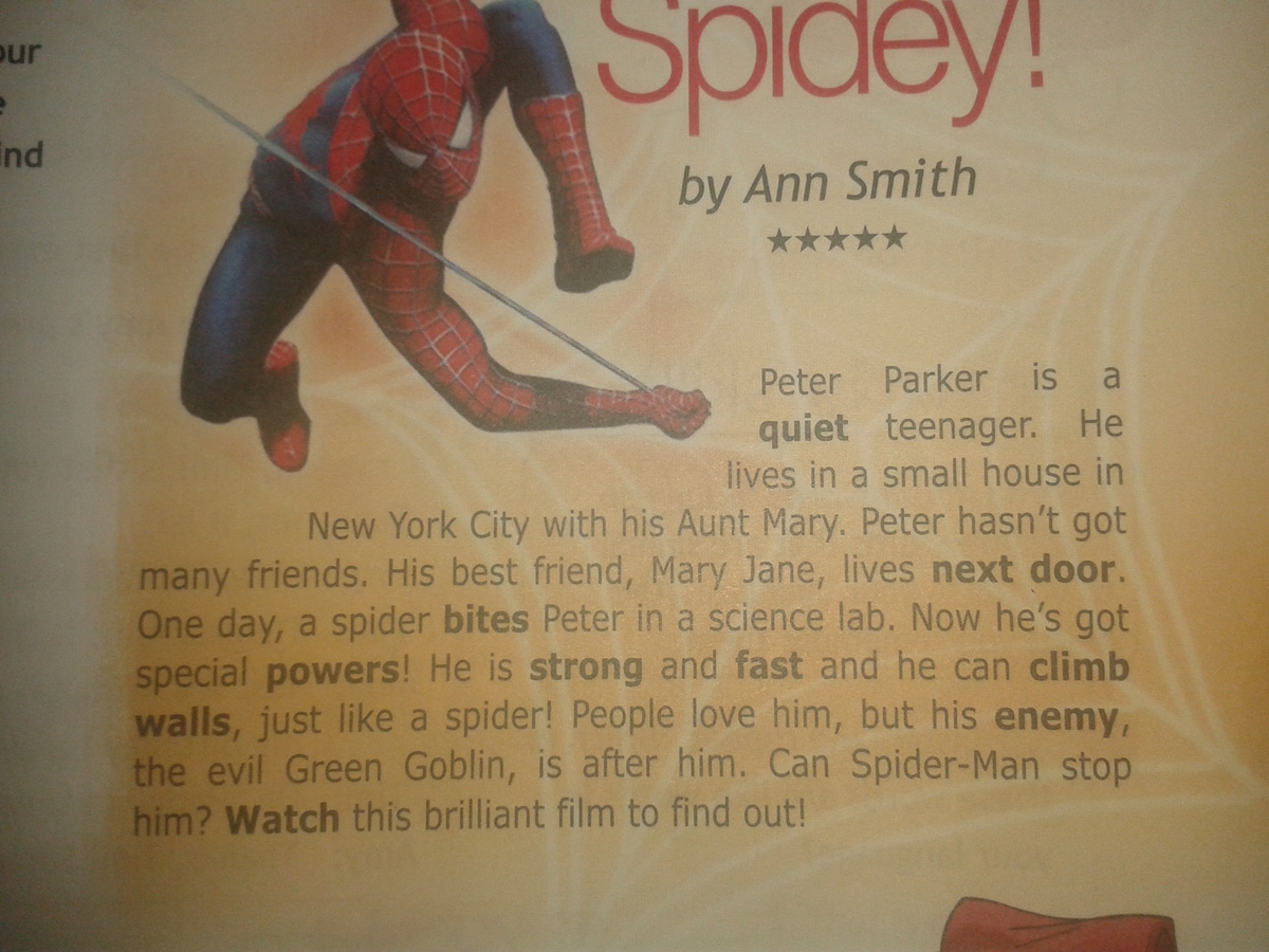 Питер Паркер спокойный(тихий) подросток.Он живёт в маоеньком доме в городе Нью йорк со своей тётей Мери.У Питера не было много друзей.Его самый лучший друг Мери Джейн жила по соседству.Однажды в научной лаборатории Питера укусил паук.Сейсас он обладает особенными силами.Он сильный и быстрый,и взбирается на стены,как паук.Люди любят его,а его враг коварный Зелёный Гоблин охотится на него.Сможет ли человек-паук остановить его?Посмотри этот бриллиантовый фильм,чтобы узнать.