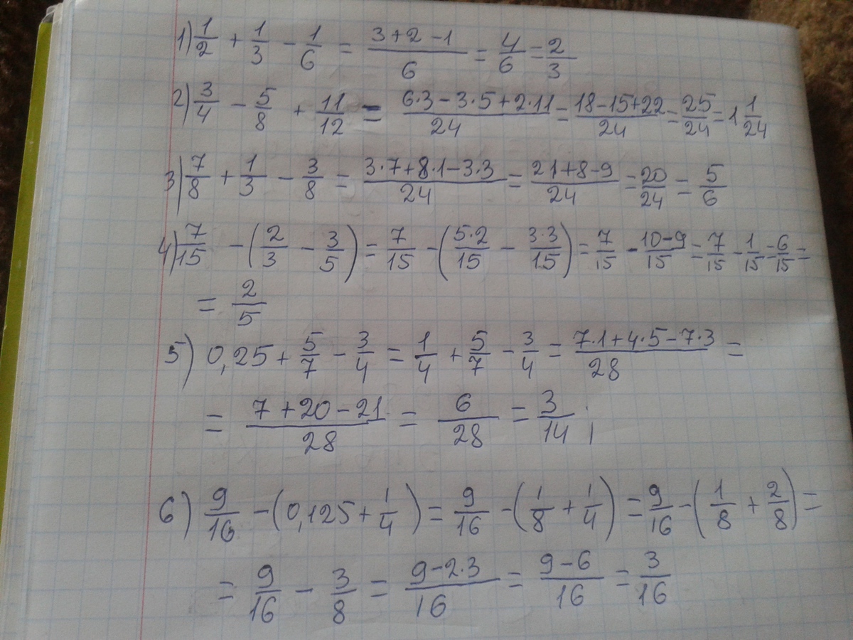 знайдiть значення виразу; 1/2+1/3-1/6 , 3/4-5/8+11/12 , 7/8+1/3-3/8 , 7/15-(2/3-3/5) , 0,25+5/7-3/4 , 9/16-(0,125+1/4) .