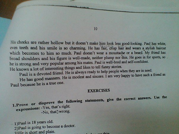 Пол хорош. Он высок и красив. Его лицо круглое с хорошими чертами лица. У него большие и серые глаза. Его ресницы не длинные, но толстые. Его брови тёмные и густые. Его лоб высокий. Он имеет прямой нос, хороший вырез губ и круглый подбородок. Его щеки довольно тощие, но это не делает его внешность хуже. У Пола белоснежная улыбка, и его улыбка такая очаровательная. Он справедлив, решителен и у него стильная прическа, которая ему так идет. У Пола нет бороды или усов. У моего друга широкие плечи, у него хорошее телосложение, он не толстый и не худой. Он занимается спортом, поэтому он сильный и популярный среди своих товарищей. Он воспитанный и уверенный в себе. Он знает о очень интересных вещах, и любит рассказывать веселые истории. Пол преданный друг. Он всегда помогает людям, когда им нужна помощь. У него хорошие манеры. Он скромный и искренний. Я очень счастлив что у меня есть такой друг как Пол, потому-что он такой лишь один.