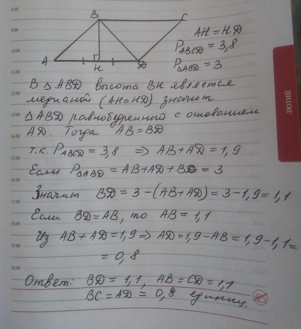 в Параллелограмме ABCD перпендикуляр опущенный из вершины B на сторону AD делит ее пополам. периметр параллелограмма равен 3,8 а периметр треугольника