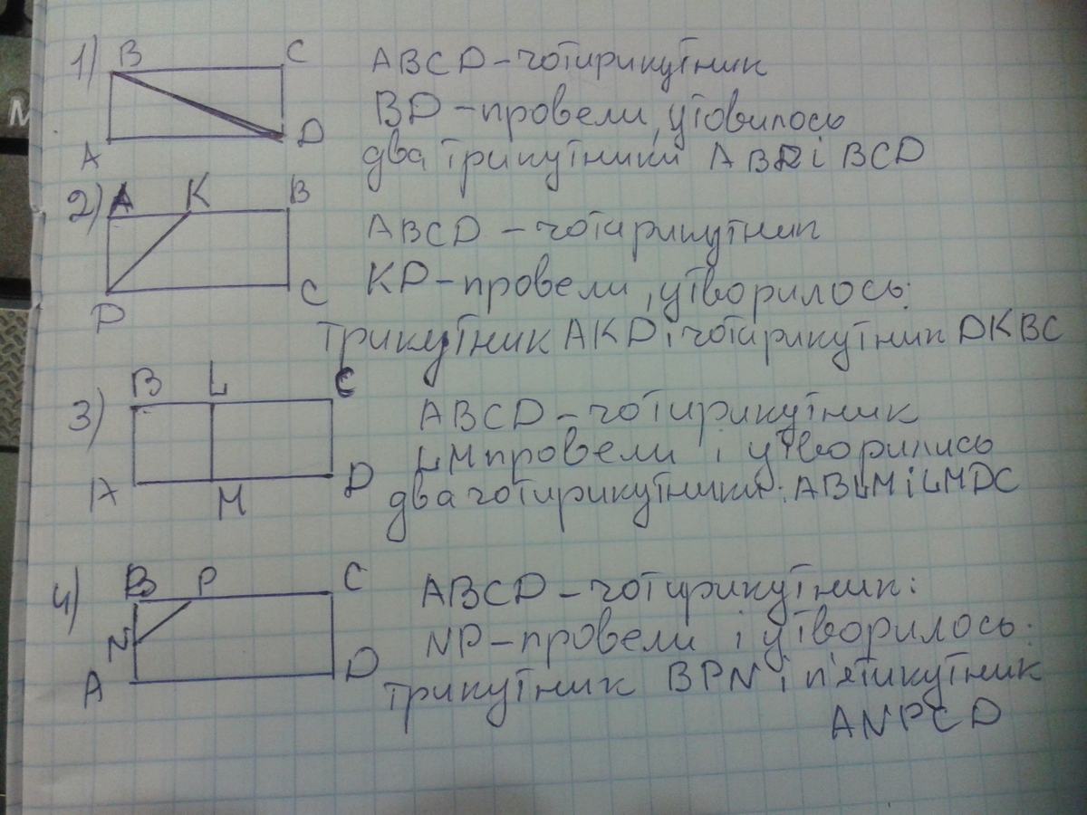 побудуй 4 одинакових чотирикутники і проведи в кожному відрізок так щоб утворились 1)два трикутники 2)трикутник і чотирикутник 3)два чотирикутники 4)трикутник і пятикутник