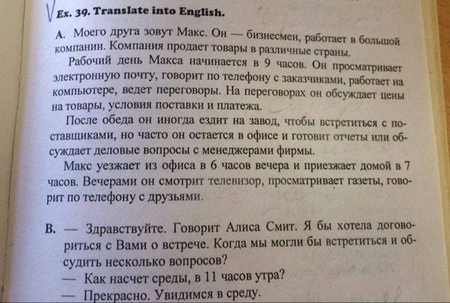 The working day of Max begins at 9 o'clock. It looks through e-mail, speaks on the phone with customers, works on the computer, carries on negotiations. At negotiations it discusses the prices for the goods, terms of sale and payment.