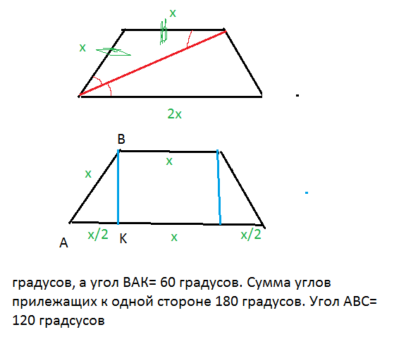 В прямоугольном треугольнике АВК катет АК равен половине гипотенузы, значит угол АВК равен 30 градусов. Эта часть текста почему-то исчезла. А угол ВАК равен 60 градусов.