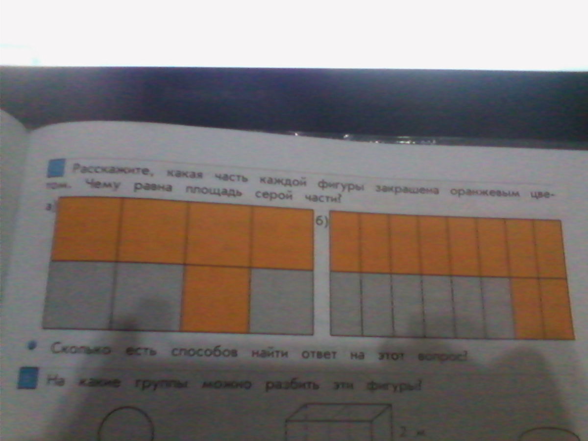 Расскажите,какая часть каждой фигуры закрашена оранжевым цветом.Чему равна площадь серой части?только нормально и понятно!!!