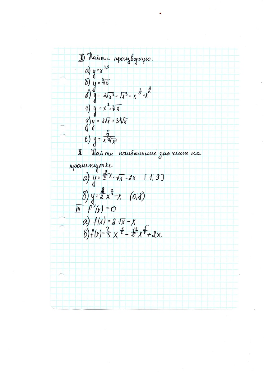 3)\ y = x^{frac{2}{3}} + x^{frac{3}{2}}\ (y)^` =( x^{frac{2}{3}} + x^{frac{3}{2}})^` =( x^{frac{2}{3}}) ^`+ (x^{frac{3}{2}})^` = frac{2}{3}x^{(frac{2}{3} - 1)} + frac{3}{2}x^{(frac{3}{2} -1)} =\ =frac{2}{3}x^{(-frac{1}{3} )} + frac{3}{2}x^{frac{1}{2}} = frac{2}{3}frac{1}{sqrt[3]{x}} } + frac{3}{2}sqrt{x}=frac{2}{3sqrt[3]{x}} } + frac{3}{2}sqrt{x}