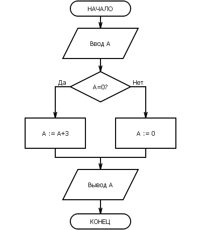 Дано целое число А. Если значение А=0,то необходимо увеличить его на 3,иначе присвоить А значение,равное 0. Разработать схему алгоритма для решения этой задачи. Протестировать алгоритм для А=0, А=-1, А=8. Информатика.