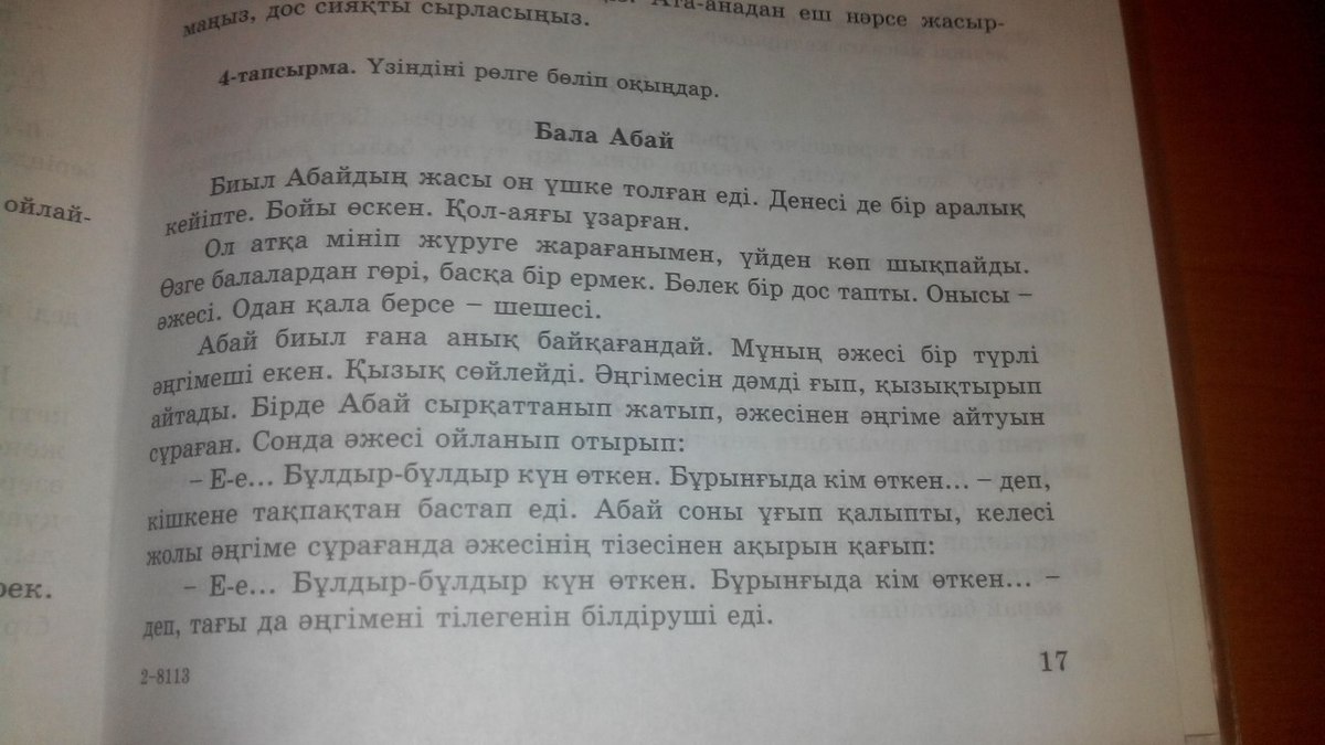 Абай только в этом году заметил, что его бабушка отличная рассказчица. Интересно рассказывает. Однажды Абай заболел, и попросил ее рассказать ему сказку. Тогда она задумалась и начала с стихотворения: