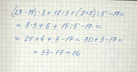 (27-19)*3+18/3+(8+7)/5-17=8*3+18/3+15/5-17=24+6+3-17=16