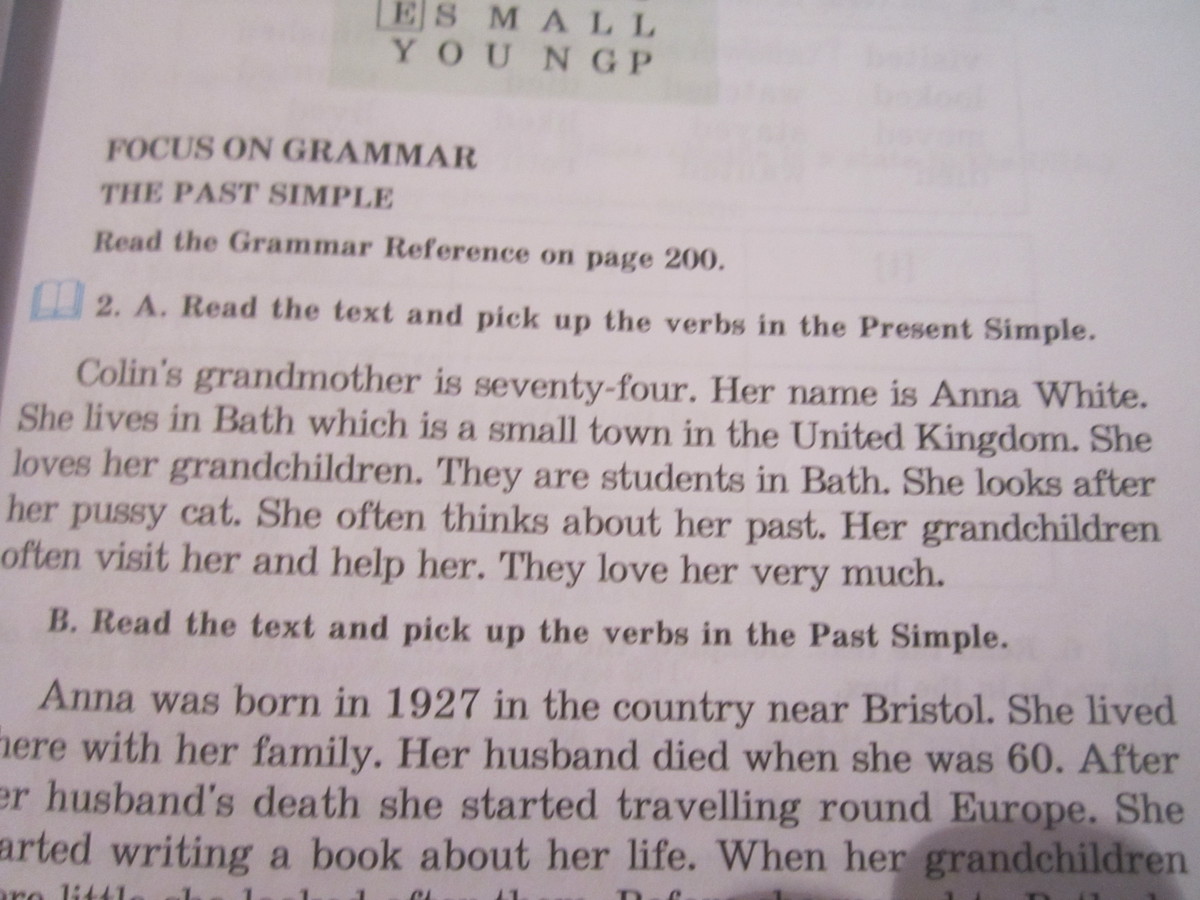 A. Бабушке Колина семьдесят четыре года. Её зовут Анна Уайт. Она живёт в Бат, маленький город в Великобритании. Она любит своих внуков. Они учатся в Бате. Она ухаживает за своим котёнком. Она часто думает о своём прошлом. Её внуки часто навещают её и помогают ей. Они её очень сильно любят.