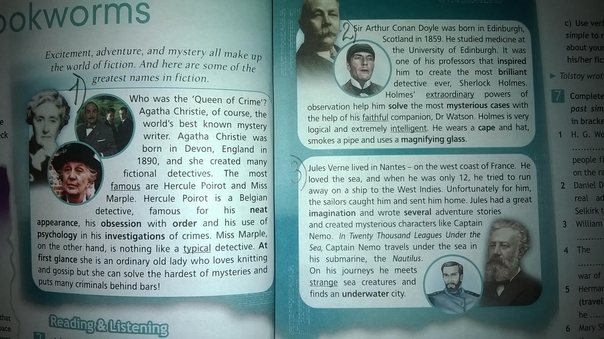 1)Кто был "королевой детектива"? Конечно же, Агата Кристи, известнейшая в мире загадочная писательница. Агата Кристи родилась в Девоне, Англия, в 1890, и создала много вымышленных детективов. Наиболее известными являются Эркюль Пуаро и мисс Марпл. Эркюль Пуаро бельгийский детектив, известный своим аккуратным внешним видом, любовью к порядку и использованием психологии во время расследований. С другой стороны, мисс Марпл не похожа на обычного детектива. На первый взгляд, она обычная старушка, которая любит вязать и сплетничать, но она может отгадать самые тяжелые тайны и расследовать преступления
