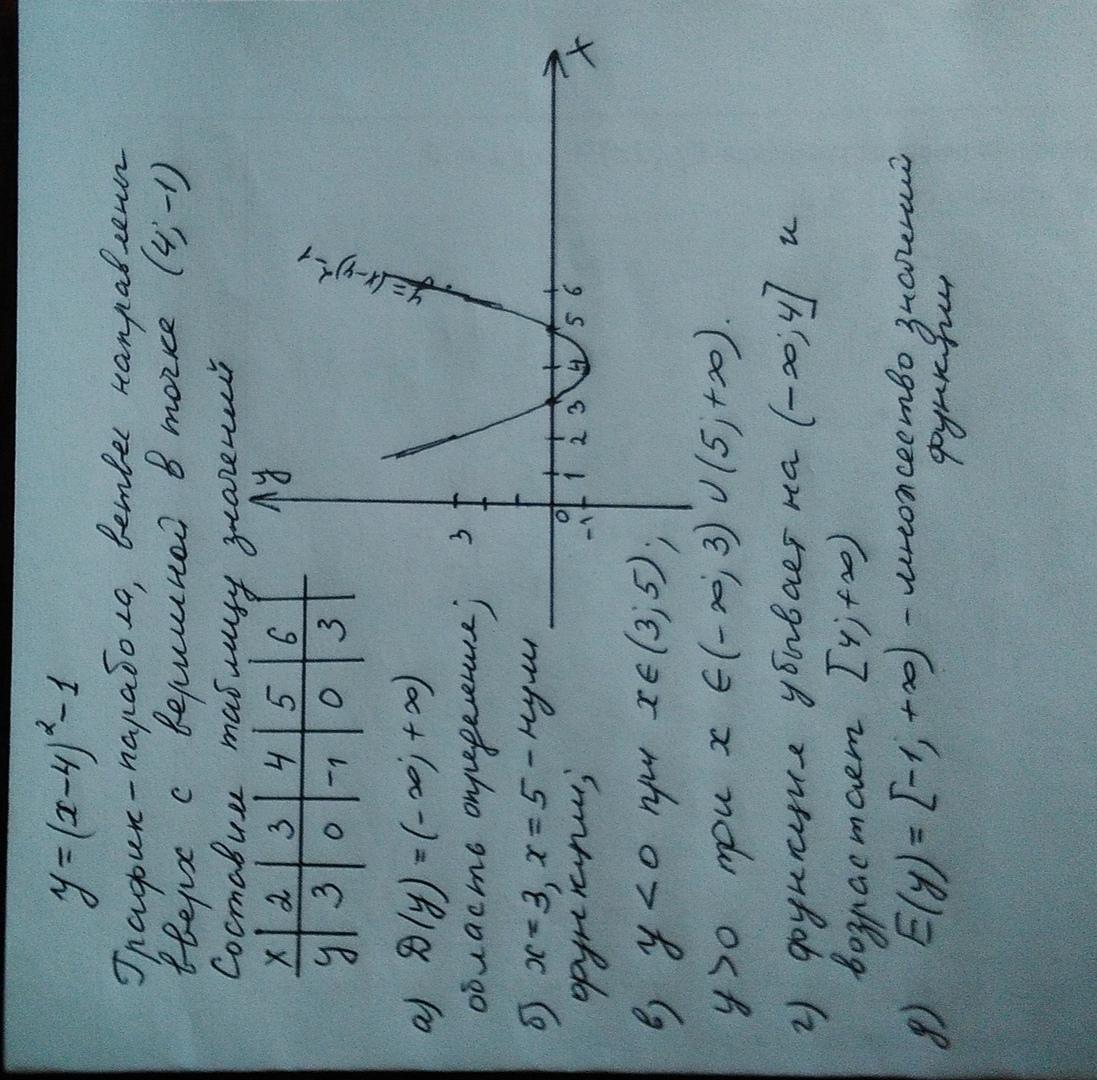 построить график функции y=(x-4)в квадрате-1. укажите для этой функции: а) облость определения; б) ноль; в) промежутки знакопостояннства; г) промежутки растоянния (убывания); д) область изменения