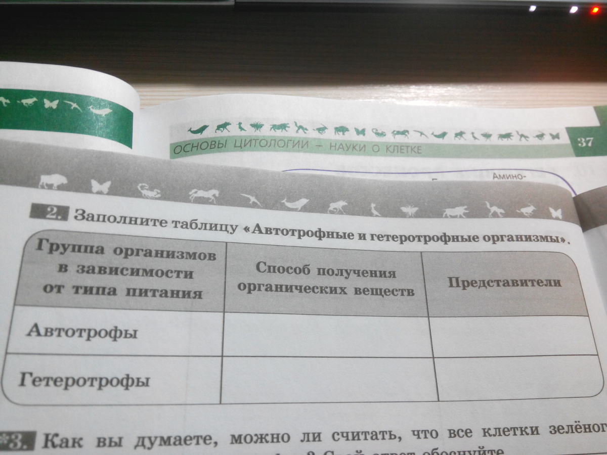 Заполните таблицу "Автотрофные и гетеротрофные организмы"