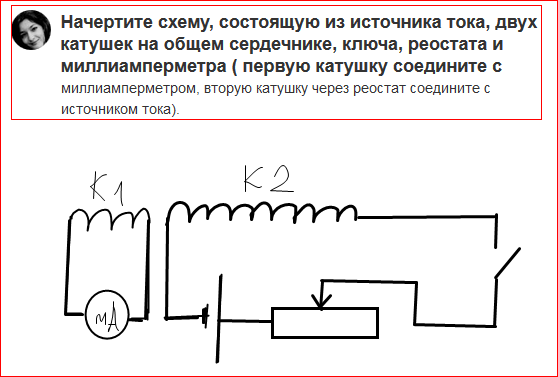 Начертите схему, состоящую из источника тока, двух катушек на общем сердечнике, ключа, реостата и миллиамперметра ( первую катушку соедините с миллиамперметром, вторую катушку через реостат соедините с источником тока).