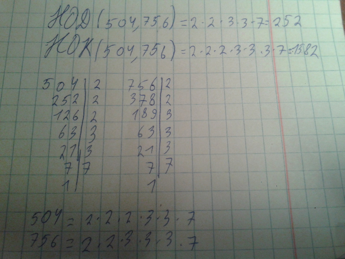 НОД (504 и 756) = 2 * 2 * 3 * 3 * 7 = 252 - наибольший общий делитель