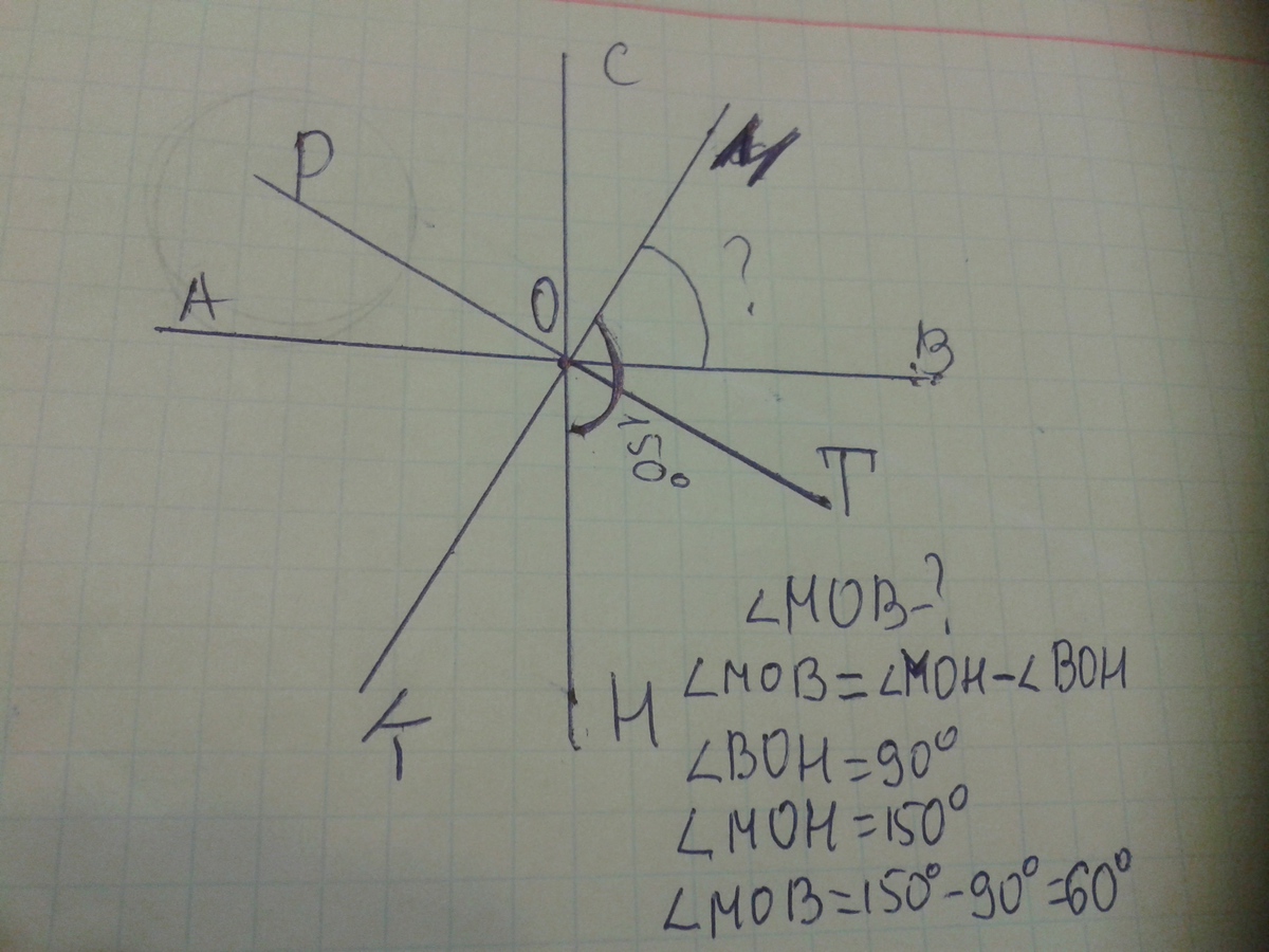через точку О проведены прямые АВ,СН,МК,РТ так , что АВ перпендикулярна СН,МК перпендикулярна РТ.Найдите тупой угол между прямыми АВ и МК , если тупой угол между прямыми СН и МК равен 150 градусов .