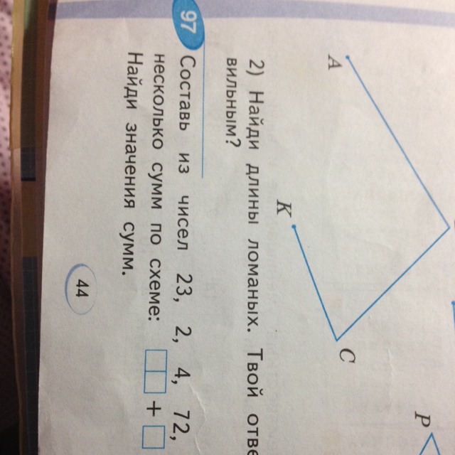Составь из чисел 23,2,4,72,3,85,43 несколько сумм по схеме .......найди значения сумм.