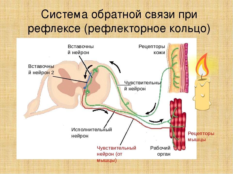 В ответ на раздражитель наша нервная система вырабатывает ответ. Это происходит с участием рефлекторной дуги ( раздражитель-рецептор-чувствительный нейрон, ЦНС-двигательный нейрон-орган -эффектор). Когда рефлекторная дуга сработала, ЦНС нужно сдать - достаточен ли выработанный ответ. Для этого существуют обратные связи от рецепторов органа - исполнителя к ЦНС. Они помогают корректировать ответ ЦНС в ответ на раздражение.