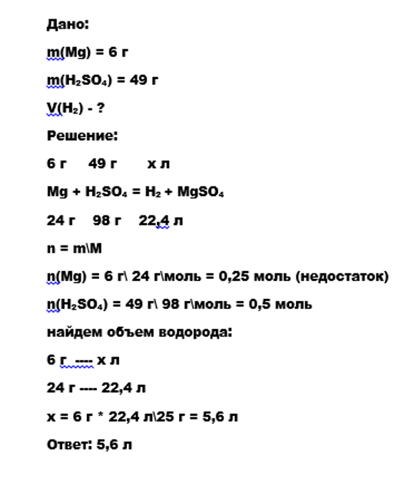 Определите объем водорода выделившийся при взаимодействии 6 г магния с раствором содержащим 49г серной кислоты