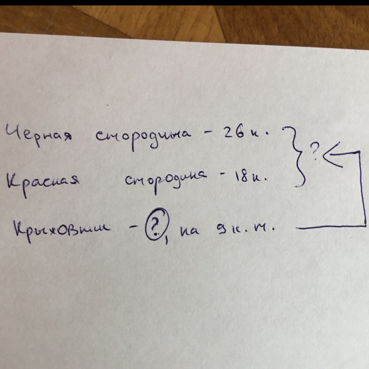 помогите написать краткое условие к данной задаче: В саду посадили 26 кустов черной смородины и 18 кустов красной, а крыжовника - на 9 кустов меньше, чем кустов красной и черной смородины вместе. Сколько кустов крыжовника посадили в саду?