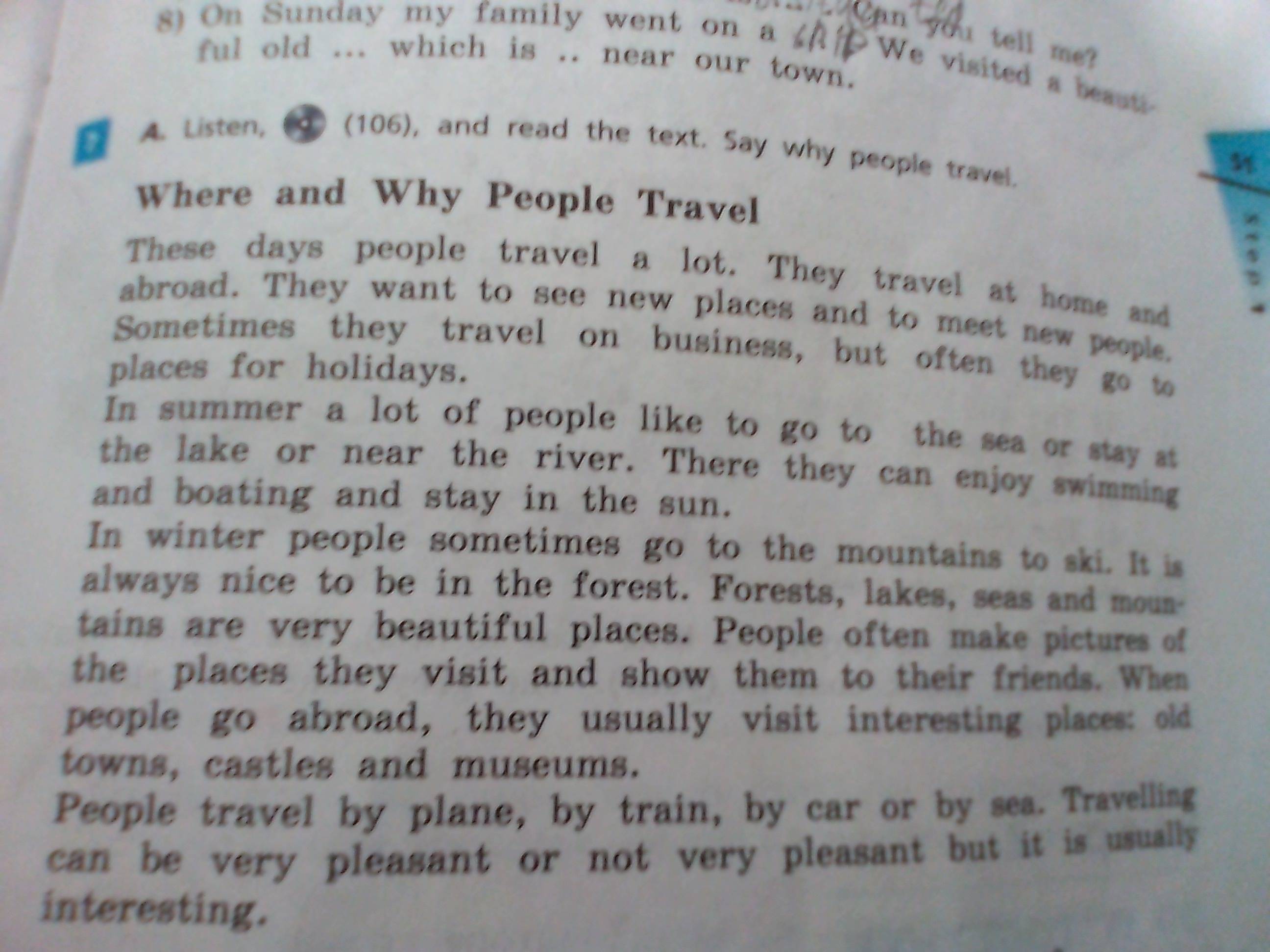Люди путешествуют на самолёте, на поезде, на машине или по морю. Путешествовать может быть приятно или не очень приятно, но это всегда интересно.