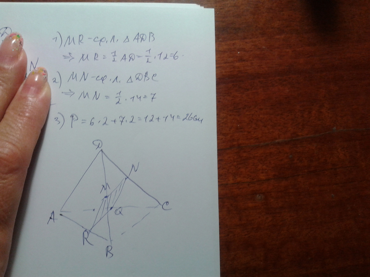 дана пирамида DABC.точки М,N,Q,R-середины ребер Bd,CD,AC и AB соотвественно.Найдите периметр четырех угольника MNQR,если AD=12,BC=14