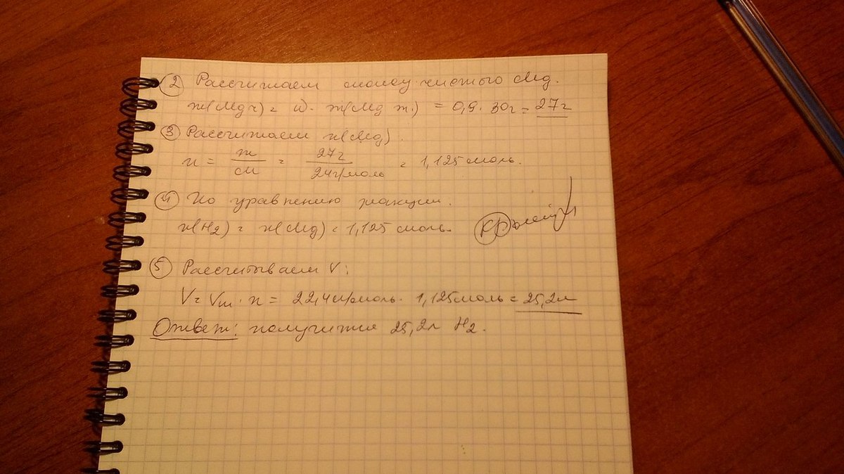 Найти объем водорода, который можно получить взаимодействием 30г магния содержащего 10% примесей с избытком соляной кислоты.