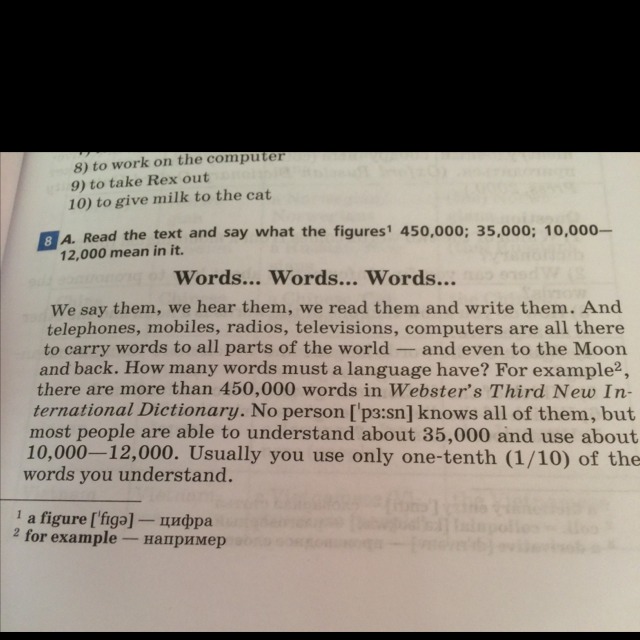 Мы говорим их, мы слышим их, мы читаем их и пишем их. И телефоны, мобильники, радио, телевидение, компьютеры все для того, чтобы доносить слова до всех частей света - и даже до Луны и обратно. Сколько слов должно быть в языке? Например, в Третьем Новом Международном Словаре Вебстера насчитывается больше 450 000 слов. Ни один человек не знает все из них, но большинство людей способны понимать около 35 000 и использовать 10 000-12 000. Обычно вы используете только одну десятую часть тех слов, которые понимаете.