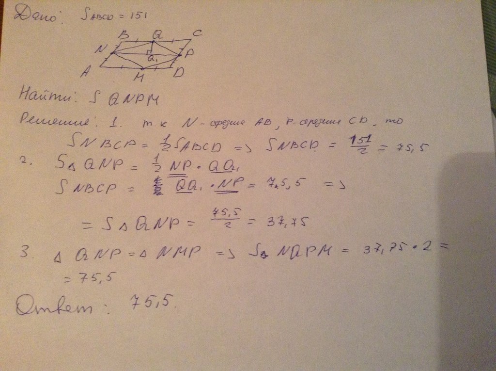 Площадь параллелограмма ABCD равна 151. Найдите площадь параллелограмма