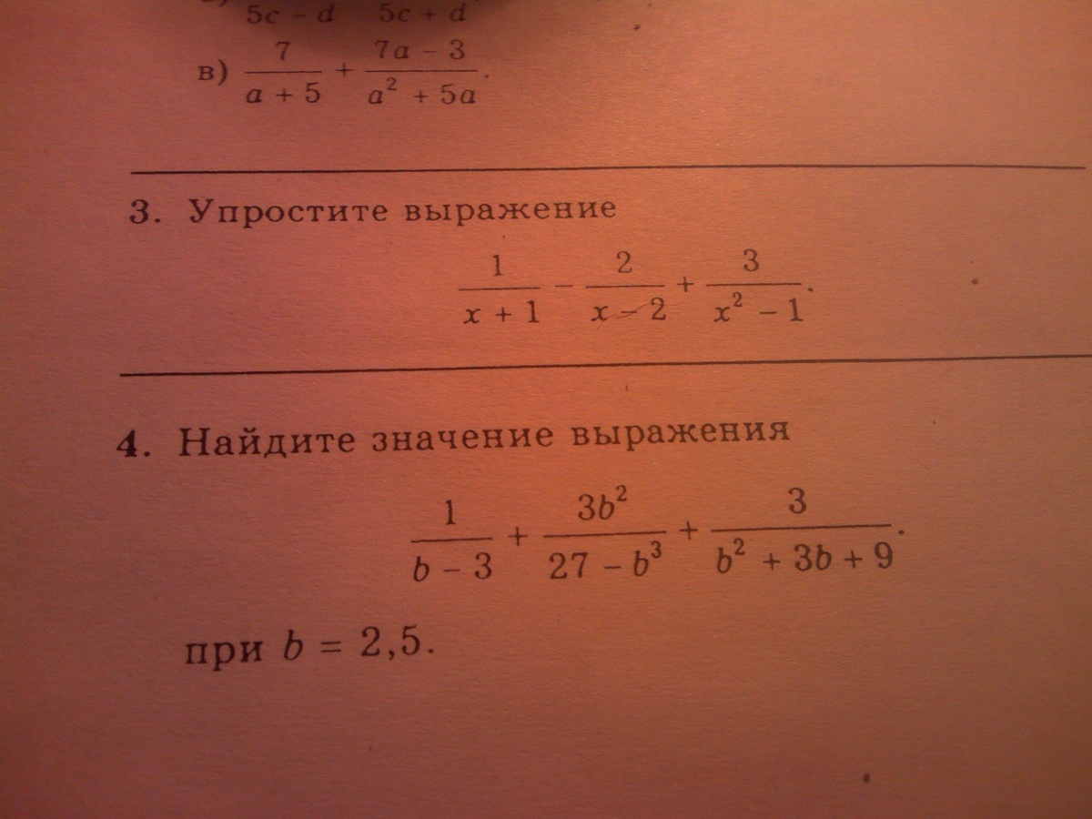 4) 1 / (b - 3) -3b^2 / (b^3 - 3^3) + 3 / (b^2 + 3b + 9) = [b^2 + 3b + 9 - 3b^2 + 3b - 9] / (b - 3)(b^2 + 3b + 9) = (-2b^2 + 6b) / (b - 3) (b^2 + 3b + 9) = -2b(b - 3) / (b-3)(b^2 + 3b + 9) = -2b / (b^2 + 3b + 9) = -2 * 2.5 / (2.5^2 + 3 * 2.5 + 9) = - 5 / 22.75 = - 20/91