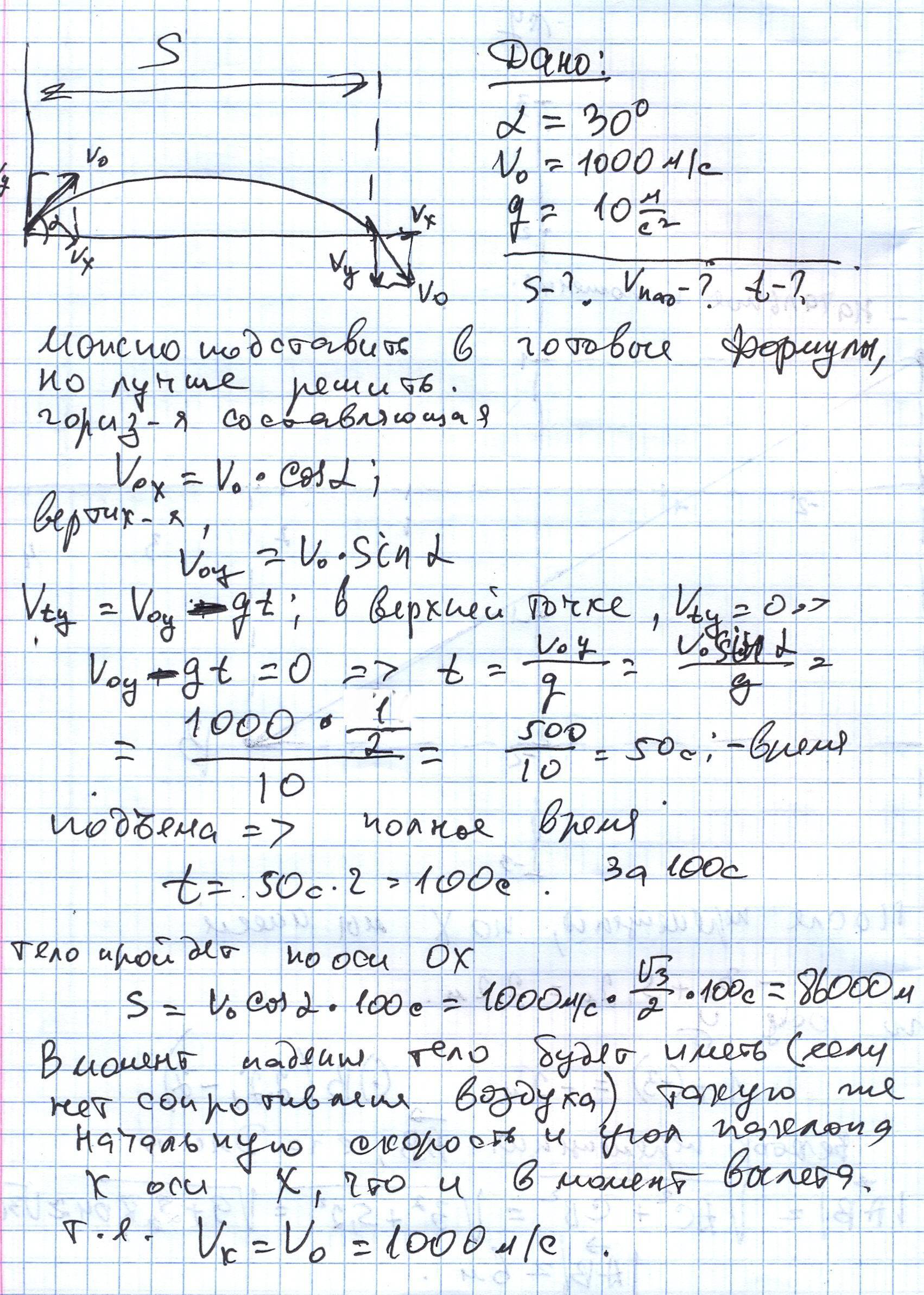Снаряд вылетел из дальнобойной пушки с начальной скоростью 1000 м/с под углом 30 градусов к горизонту. Сколько времени снаряд будет находится в воздухе? На каком расстоянии от пушки он упадет на землю? Пушка и и точка падения снаряда находятся на одной горизонтали. Какую скорость будет иметь снаряд в момент падения на землю?
