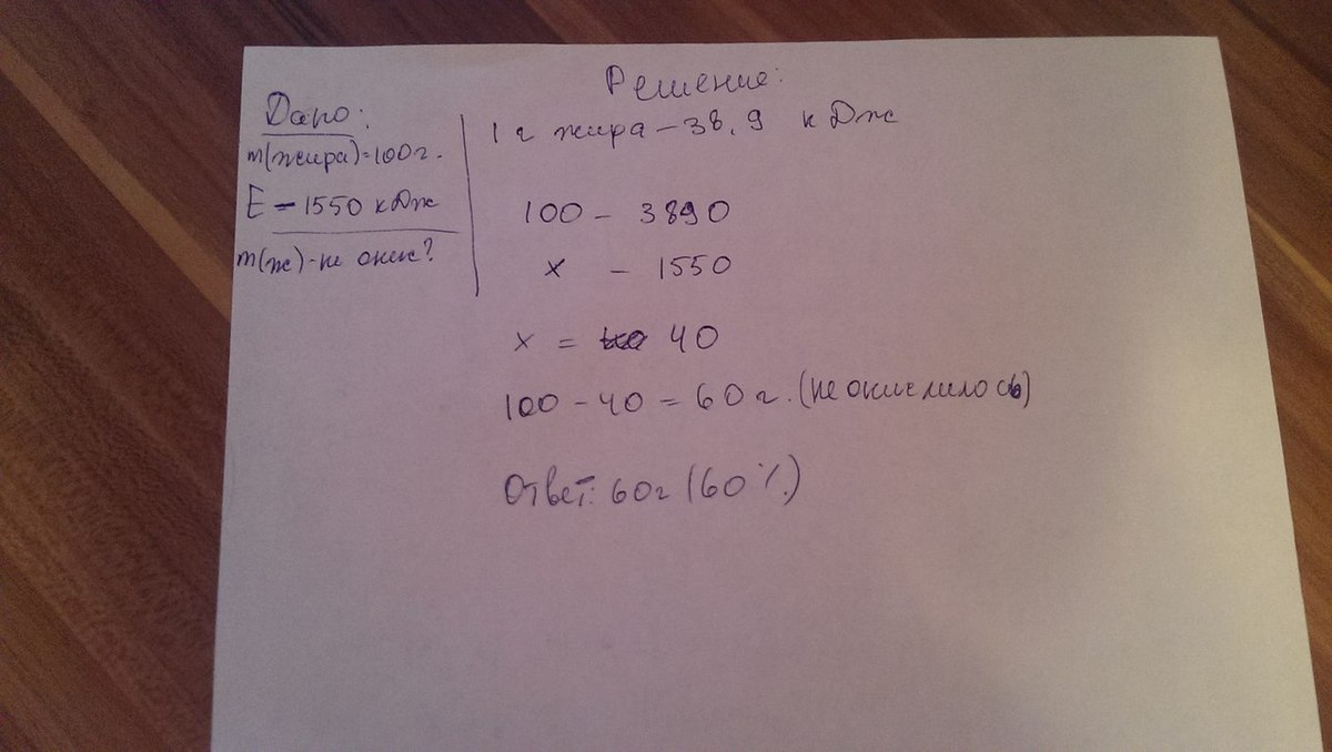 При окислении 100 г жира выделилось 1550 кДж энергии. Сколько жиров ( в граммах,в %) не подверглось окислению?