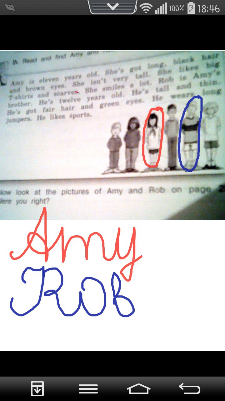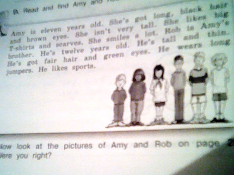 Перевод: Эми одиннадцать лет. У неё длинные, черные волосы и коричневые (карие ) глаза. Она не очень высокая. Она любит носить футболки и шарфы. Она много улыбается. Роб это брат Эми. Ему двенадцать лет. Он высокий и худой . У него светлые волосы и зеленые глаза. Он носит длинные джемперы (свитера) . Он любит спорт. Read and find Amy and Rob in the picture.- Прочтите и найдите на картинке Эми и Роба по описанию из текста . Как вы и догадались среди стоящих в этом ряду , девочка с черными волосами , в футболке и шарфе -это Эми (третья справа ) и Роб это мальчик, высокий и худой со светлыми волосами в свитере длинном , спортивного стиля (он второй слева) .