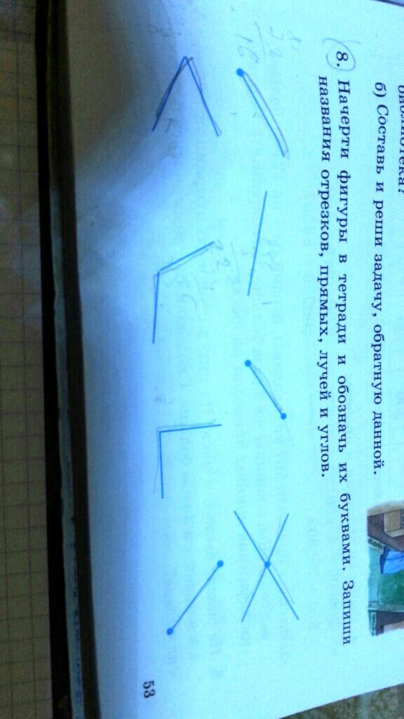 палочки без точек - прямые,палочки одной с точкой - лучи,палочки с точками на 2-х концах - отрезки,а с углом - углы.