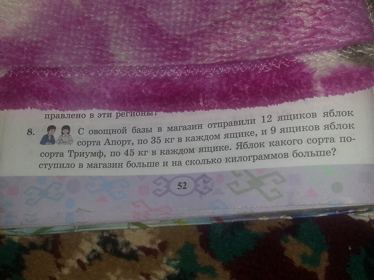 с овощной базы в магазин отправили 12 ящиков яблок сорта Апорт, по 35 кг в каждом ящике, и 9 ящиков яблок сорта Триумф, по 45 кг в каждом ящике. Яблок какого сорта поступило в магазин больше и на сколько килограммов больше?