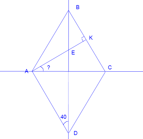 В ромбе ABCD высота АК пересекает диагональ BD в точке Е , угол ADE = 40 градусов. Найти угол ЕАС с вложением..